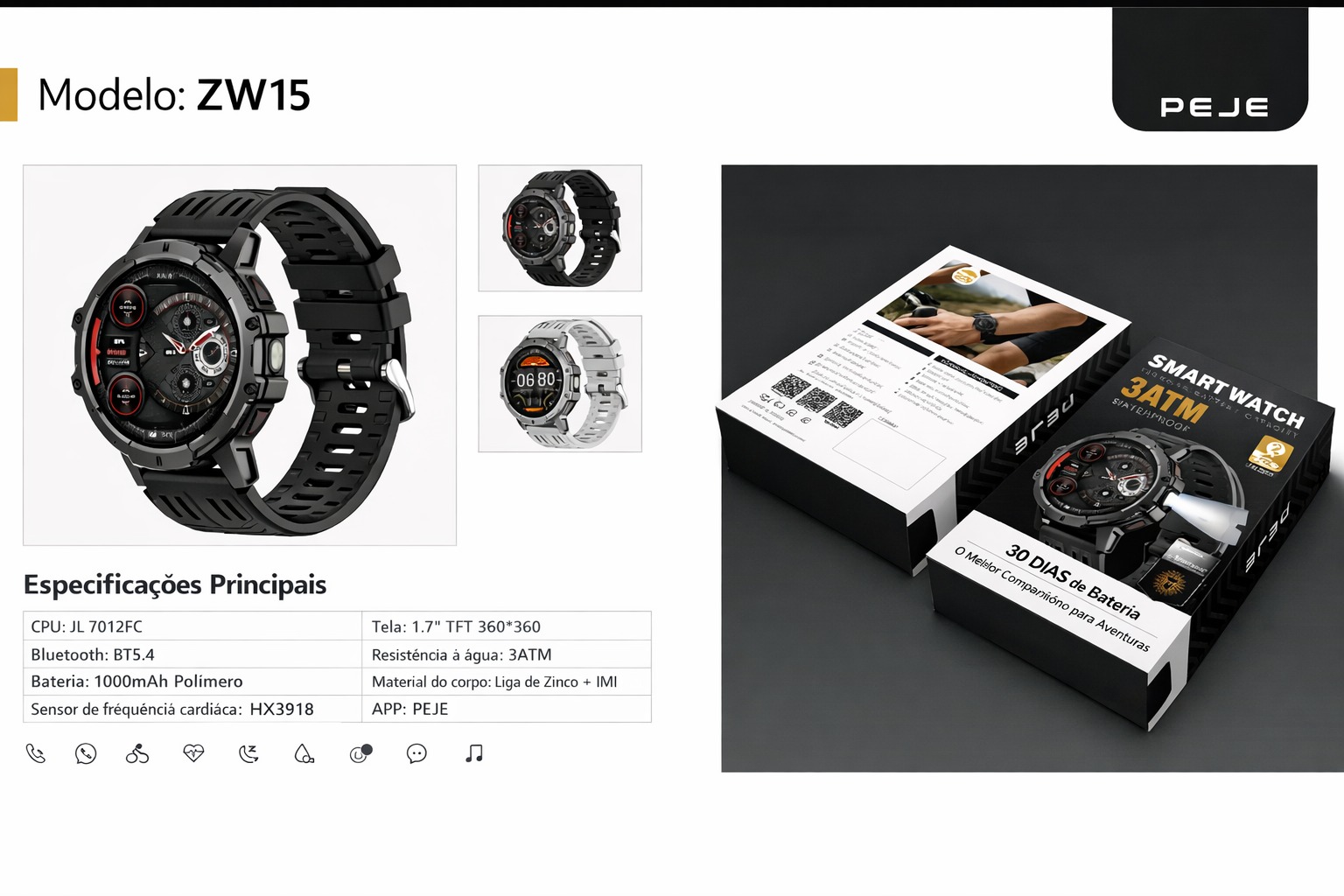 O Peje ZW15 AMOLED é um smartwatch robusto, moderno e preparado para qualquer cenário. Com bateria de alta capacidade, estrutura reforçada em liga metálica e lanterna integrada, ele foi desenvolvido para quem busca resistência, autonomia e tecnologia no dia a dia ou em aventuras ao ar livre.